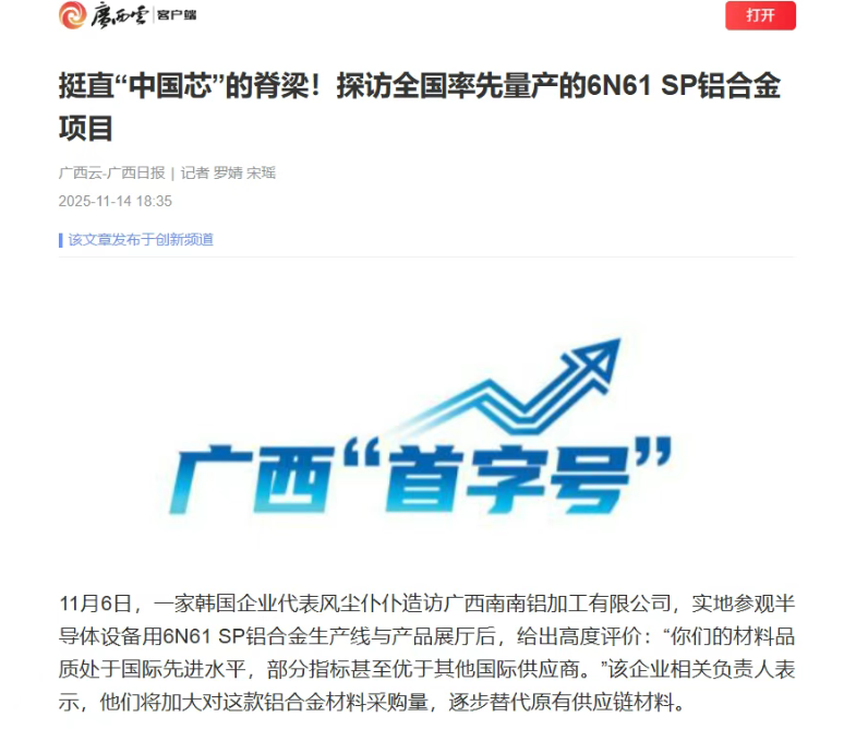 11月6日,一家韩国企业代表风尘仆仆造访广西南南铝加工有限公司,实地参观半导体设备用6N61 SP铝合金生产线与产品展厅后,给出高度评价:“你们的材料品质处于国际先进水平,部分指标甚至优于其他国际供应商。”该企业相关负责人表示,他们将加大对这款铝合金材料采购量,逐步替代原有供应链材料。
