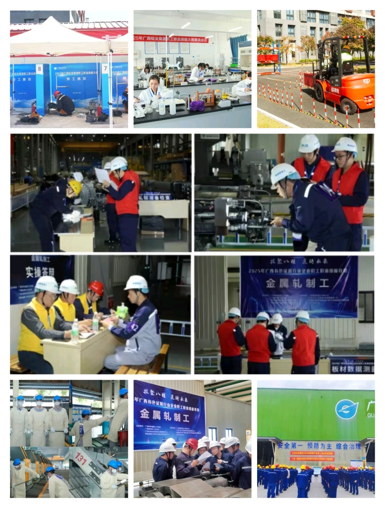 广西铝业集团通过举办各类公司内部技能竞赛、青工比武等活动,激励各类技能人才对标先进、历练技艺,自2024年以来已连续2年举办广西铝业集团职工职业技能竞赛,2025年所属生产企业举办各类技能比武超20次,覆盖全产业链关键工种,累计参赛人数近千人。所属企业南南铝加工积极承办广西有色金属行业职业技能竞赛金属轧制工竞赛,百色广投银海铝承办广西电解工竞赛,安徽广银铝业承办地区性首届行车技能竞赛。