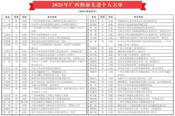 近日,由自治区纪委机关、自治区党委组织部、自治区党委宣传部联合评选的第五届“广西勤廉先进个人”名单出炉。王华、何克准、黄德文、韦勇、谢评周、何俊辉六位职工榜上有名!