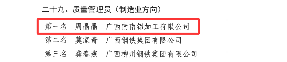 在本次大赛中,南南铝加工参赛选手沉着应战、精益求精,以扎实的理论功底与精湛的操作技能脱颖而出。最终,挤压事业部李城荣获数控车工第一名,质量管控中心周晶晶荣获质量管理员(制造业方向)第一名,质量管控中心兰海洲荣获质检员第二名,质量管控中心袁荣增荣获质检员第四名。