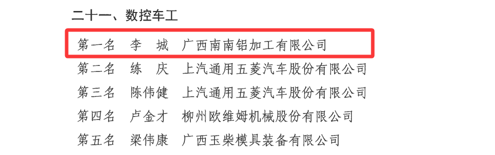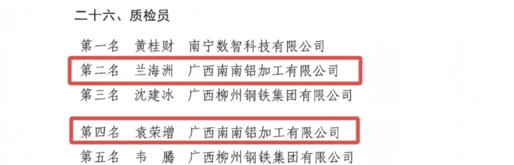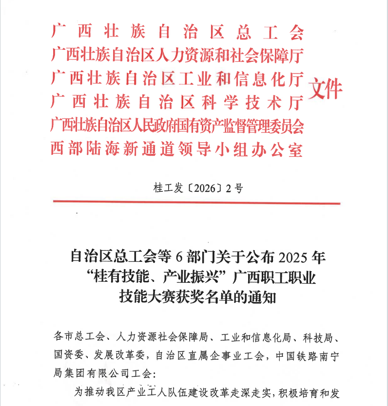 近日,自治区总工会发布了《自治区总工会等6部门关于公布2025年“桂有技能、产业振兴”广西职工职业技能大赛获奖名单的通知》(桂工发〔2026〕2号),南南铝加工在全区高水平技能比拼中表现突出,一举斩获4项荣誉,创造自公司工会成立以来在自治区级比赛中取得的最好成绩,充分展现公司技能人才的过硬实力和竞技水平。
